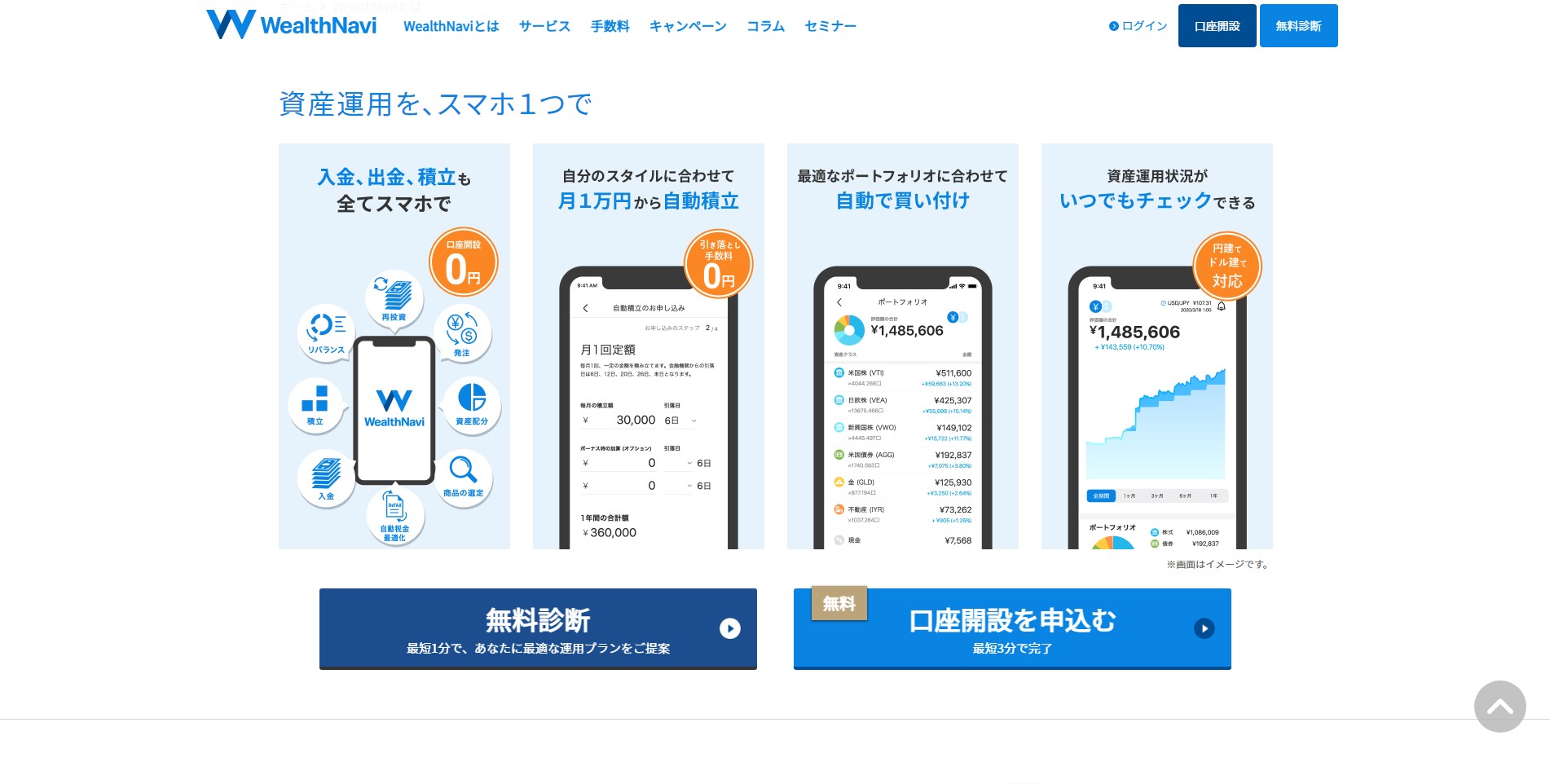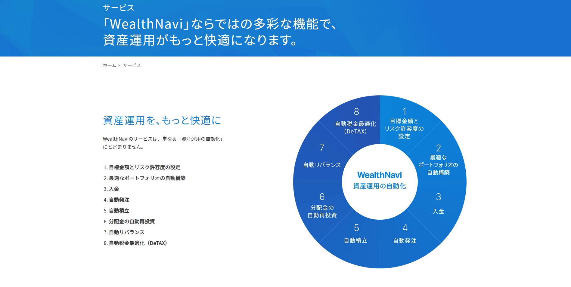 「WealthNavi」は、ノーベル賞受賞者が提唱する理論に基づき、6~7つのETF(上場投資信託)を通じて、世界約50カ国1万1,000銘柄に分散投資。資産配分の決定から発注、積立、リバランス、税金最適化まですべて自動で行うという特徴を持つ。