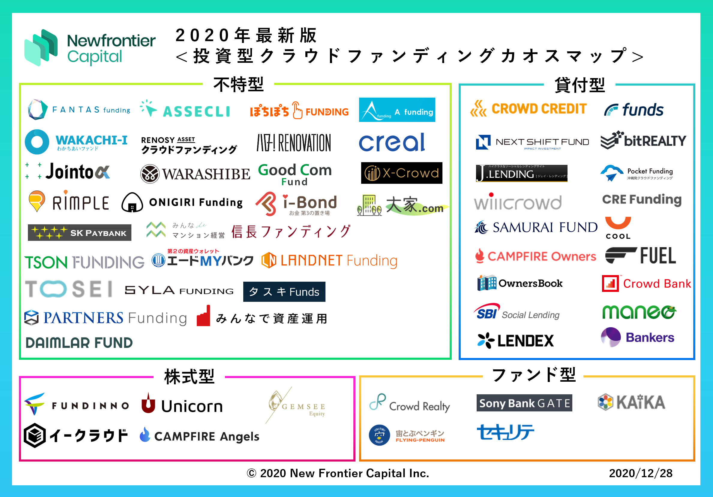 New Frontier Capital株式会社は12月28日、『2020年最新版投資型クラウドファンディング業界カオスマップ』を公開した。同社は、金融・不動産・電力を中心に許認可の取得から、新規事業の立ち上げ・運営までをワンストップで担う、総合士業テックファームである。