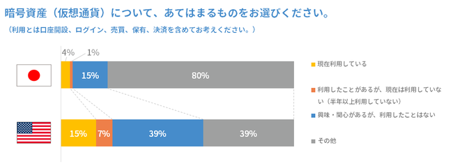 - 利用経験にも大きな差が出て、日本では暗号資産を利用した経験のある人は5%にとどまったが、米国では22%に拡大した