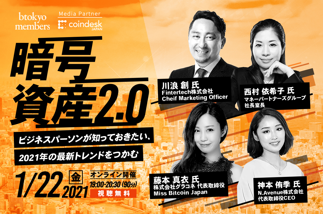 主催はbtokyo membersで、coindesk JAPANがメディアパートナーを務めるほか、イベントのモデレートはN.Avenueの神本侑季氏が行う。参加は無料だが、btokyo membersの会員登録が必要だ。