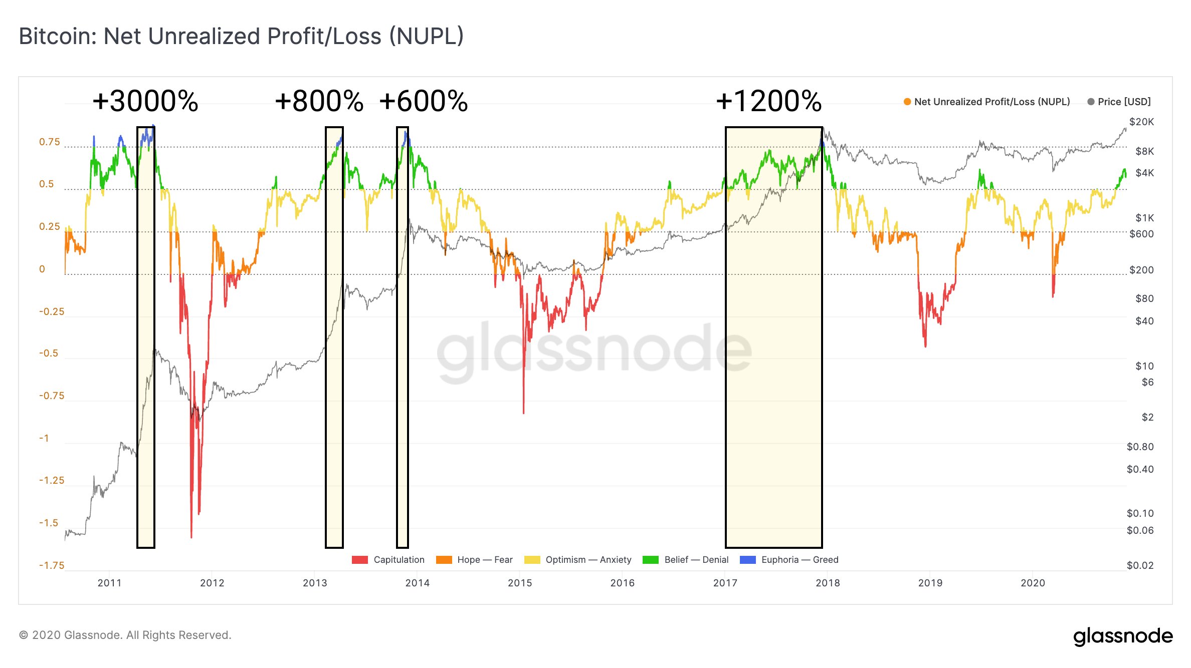 Glassnodeによると、NUPLのグラフで、左軸の数字を基準にした色のついた線がゼロから上の場合は、BTCネットワーク全体が利益が出ている状態を意味するという。一方、逆に下の場合は損失が出ている状態を指す。ゼロから上に離れていればいるほど、市場の強気トレンドかつバブル相場である可能性を示している。