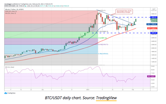 ビットコインは2月2日にダウントレンドラインを突破し、それに派生してさらなる上昇に向けた動きが出ている。相対力指数(RSI)がポジティブゾーンに上昇し、20日指数移動平均線(33,945ドル)が上昇に転換。強気派が有利である状況が顕著になっている。
