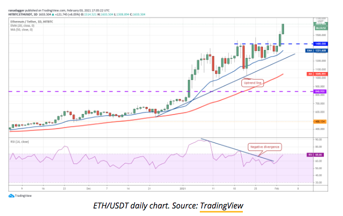 イーサ(ETH)は、2月2日に1,400ドルから1,473.096ドルの直上のレジスタンスを上抜いて急騰。続伸を続けている。これは、ビットコインの状況と似ており、強気派が上値でも買いを継続していることを示している。