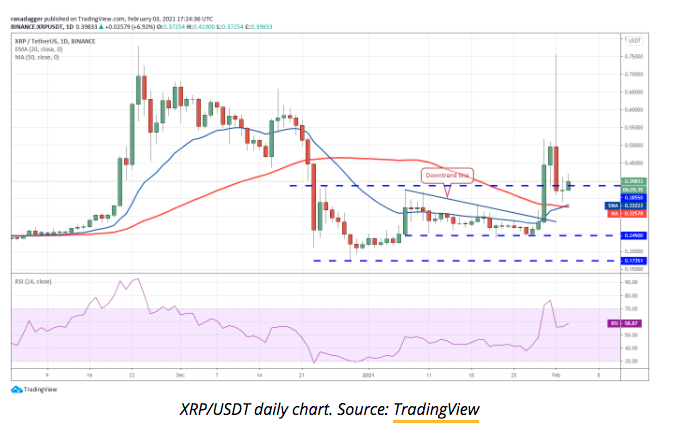 2月上旬時点でのトレンドライン分析では、強気派による価格伸長の動きが成功すれば、XRP/USDペアは0.50ドル(50円)まで上昇すると見られており、実際にこれが価格に現れた模様だ。不安定な相場が続いているが、0.60ドルまで上昇する可能性もあるという。なお、緩やかに正の傾きとなっている20日EMA(0.33ドル)とRSIがポジティブゾーンにあることは、強気派の主導権が戻ってきていることを示している。