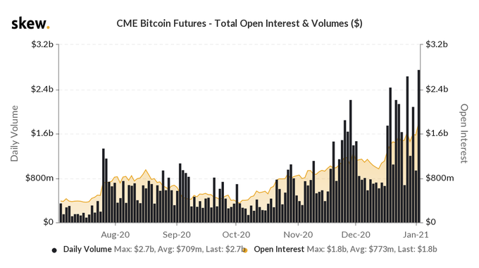 2017年末から取引が行われているCMEのビットコイン先物市場についても「3対1の割合でコール(ロング)優勢になっている」と説明。相場の高騰で資金はほとんど現物市場に流入している可能性があると分析。ビットコインの価格上昇に伴い、未決済建玉も過去最高水準に到達していると述べた。仮想通貨分析企業のSkew(スキュー)社が発表した21年1月のビットコイン先物の日間出来高は27億ドル(約2800億円)にも上っていることにも触れ、同時に大口投資家らのショートポジションが減少していると指摘した。