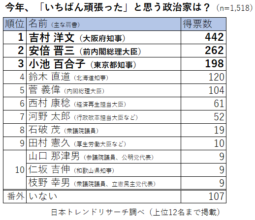 日本トレンドリサーチ(運営会社:株式会社NEXER)は12月22日、【今年いちばん頑張った政治家】についてのアンケート結果を発表した。これは全国の男女1,518名を対象にインターネット上で行っており、一人自由記述で挙げてもらう形式だ。