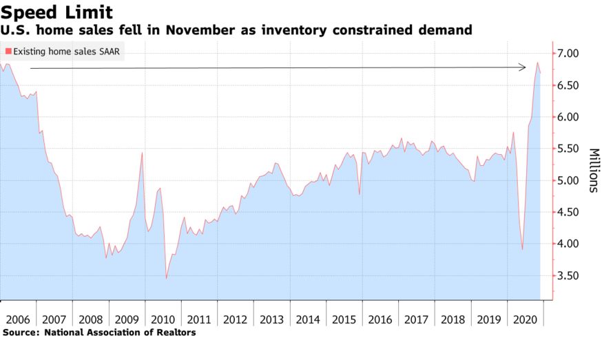 全米不動産業者協会(NAR)は22日、11月の米中古住宅販売戸数(季節調整済み)を発表した。それよると、年率換算で前月比2.5%減の669万戸と、半年ぶりに前月比マイナスとなった。市場予想は1.0%減の670万戸だった。価格高騰と記録的な在庫薄が要因と考えられる。
