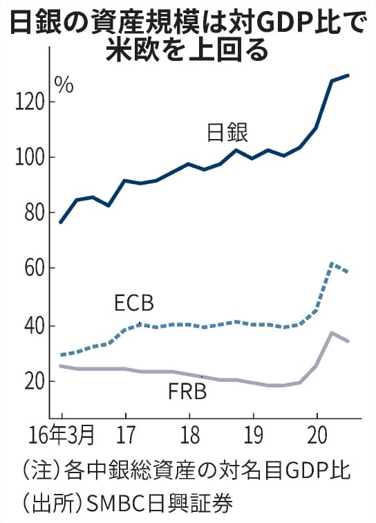 資産買い入れについては、「資産買い入れなどの効果を点検し、改善すべきところがあれば改善する」と述べた。日銀の20年12月末時点での資産は702兆円となっており、1年前に比べ129兆円増えている。国内総生産(GDP)の約1.3倍までに膨らんでおり、欧米をはるかに上回っている状態だ。企業の資金繰りや雇用を下支えする一方で、株高などの局所的なバブルを助長するとの警戒感も高まっている。