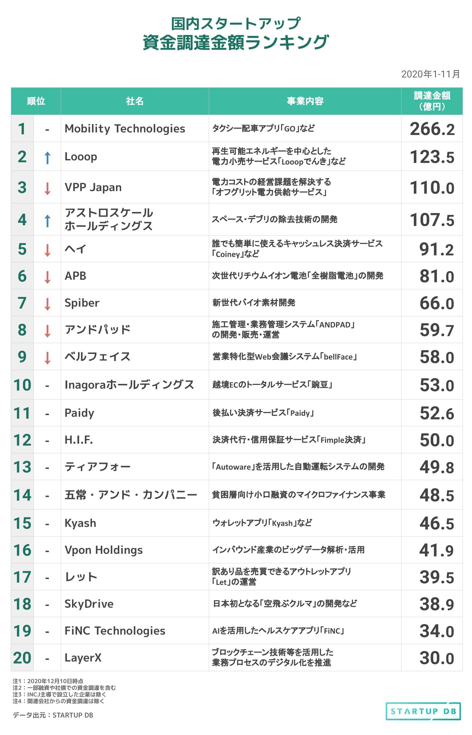フォースタートアップスは12月17日、成長産業領域に特化した情報プラットフォーム「STARTUP DB」において、2020年1月から11月までを対象とした「国内スタートアップ資金調達額ランキング」を発表した。