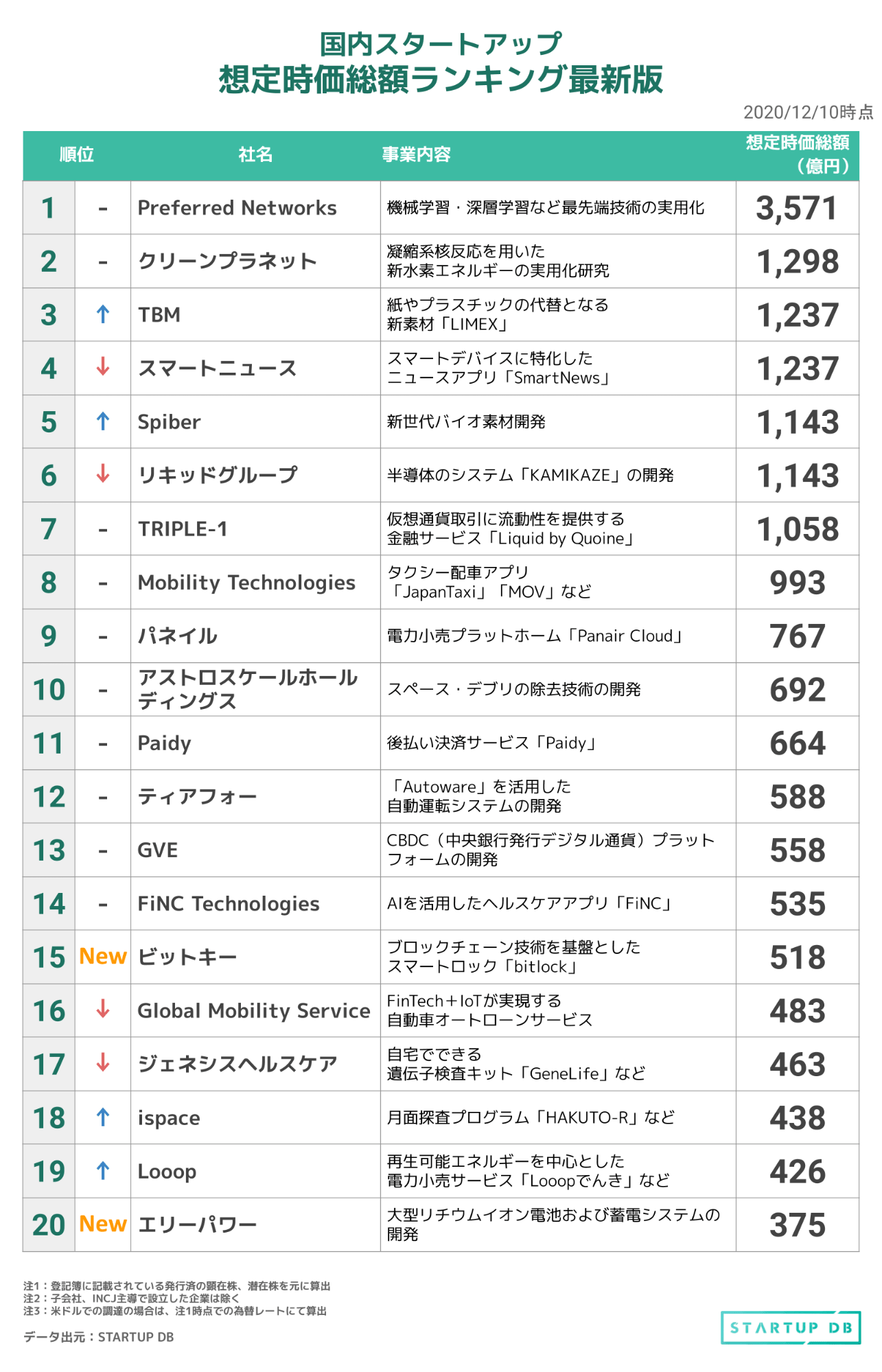 - スタートアップ想定時価総額ランキングで「ビットキー」「エリーパワー」の2社が新たにランクインした