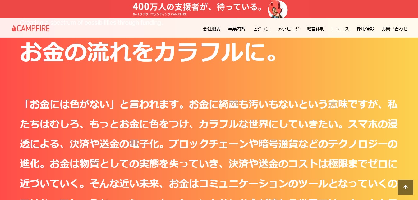 - あらゆるファイナンスニーズに応えるべく、「資金調達の民主化」 をミッションに、個人やクリエイター、企業、NPO、大学、地方自治体など、様々な挑戦を後押ししている。国内最大のクラウドファンディング「CAMPFIRE」は、2011年のサービス開始から現在までに44,000件以上のプロジェクトを掲載し、支援者数は延べ410万人以上、流通金額は360億円に達している。参考:BASE株式会社