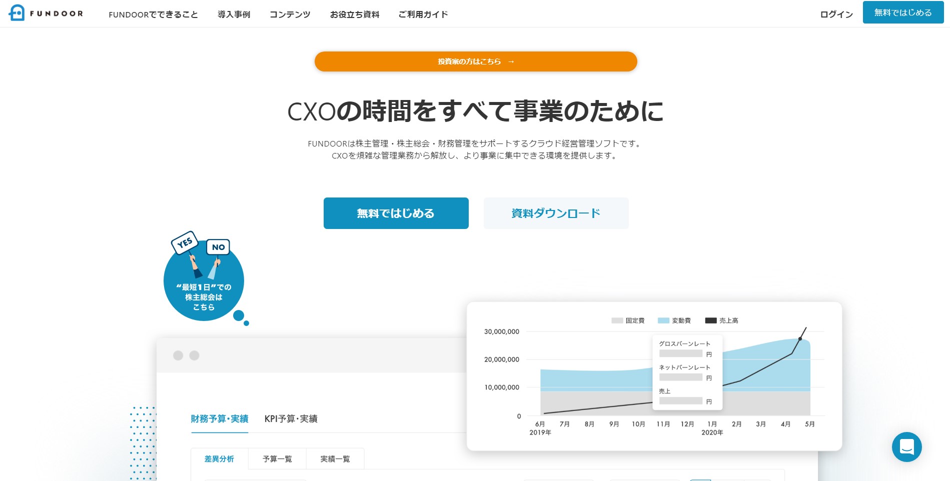 「FUNDOOR」は、資金調達に必要な流れや書類作成を支援する、未上場企業向けのサービス。専門知識がなくても将来を予測した精緻な事業計画が作成でき、株主とのコミュニケーションも図れる。