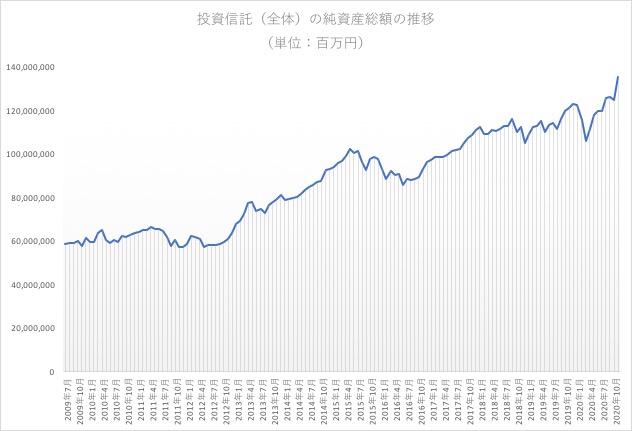 2020年11月末の純資産総額は、135兆7,250億円。初めて130兆円を超え、2ヶ月ぶりに過去最高を更新した。投資信託協会によると、世界の株式市場が上昇したことを受けて運用等が増加したことが要因。純資産の前月比での増加額(約10.8兆円)は過去最大という。