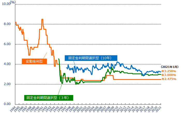 民間金融機関の住宅ローン金利推移。固定金利、変動金利ともに過去最低水準であることがわかる。引用元:flat35.