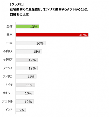 レノボ・ジャパンが7月に発表した国際調査によると、在宅勤務の生産性が「オフィス勤務に比べて低い」と答えた人の割合が日本では40%と、欧米や中国など10カ国の平均13%を大きく上回って最も多かった。日本で在宅勤務の生産性が低い理由として、「自らの勤務先企業がテクノロジーに十分な投資を行っていない」ことを67%が挙げているという。これは在宅勤務開始時に必要となったIT機器やソフトウェアの購入に表れており、会社が全額を負担したという回答者は日本では31%と、10カ国中最低であったという。こういったことから日本では在宅勤務が定着する可能性は低いと見られる。