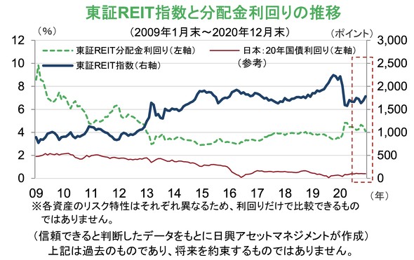 前述した悪材料に応じて考えると、①今後、ワクチン接種が進むことなどで経済が正常化すると、オフィスの空室率の上昇・家賃収入の減少の鈍化や反転が期待できる、②在宅勤務の増加が予想される一方で、在宅勤務の困難さもよく知られるようになり、近郊の駅前のオフィス・ビル需要が増大するのに伴って、アクティブ運用のREITで銘柄入れ替えも進むと期待される、③REITの分配金も①・②の点から底打ちが期待できる、④主要投資家である銀行の市場への回帰の兆しが見え始めている、といったことが注目される。現時点は、これらの状況が市場参加者に十分に浸透していないことから「割安」な状態にあると考えているようだ。