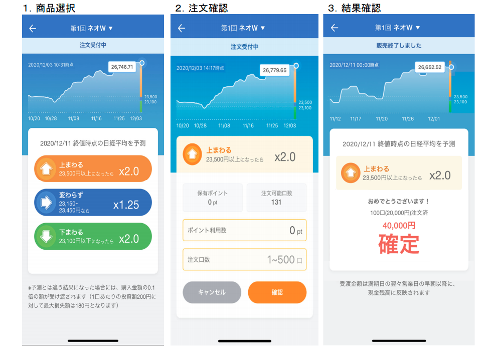 - 日経平均が上昇か下落、一定の範囲内で推移するかを選び、最低1口200円から投資が可能