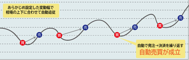 トラッキングトレードは単純な売買ロジックで継続的に注文を行い、利益を出す「リピート注文方式」の自動売買ツールです。