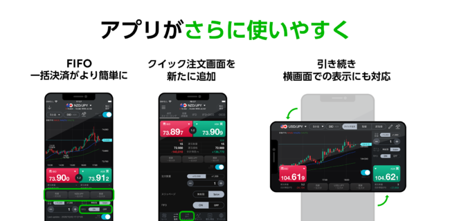 - 新たにクイック注文画面を追加し、FIFOがオンオフのみで簡単に設定できるようになったほか、注文画面からの一括決済も簡単に