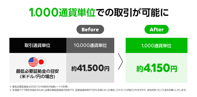 - 取引単位も引き下げ、1,000通貨単位の取引を可能となる