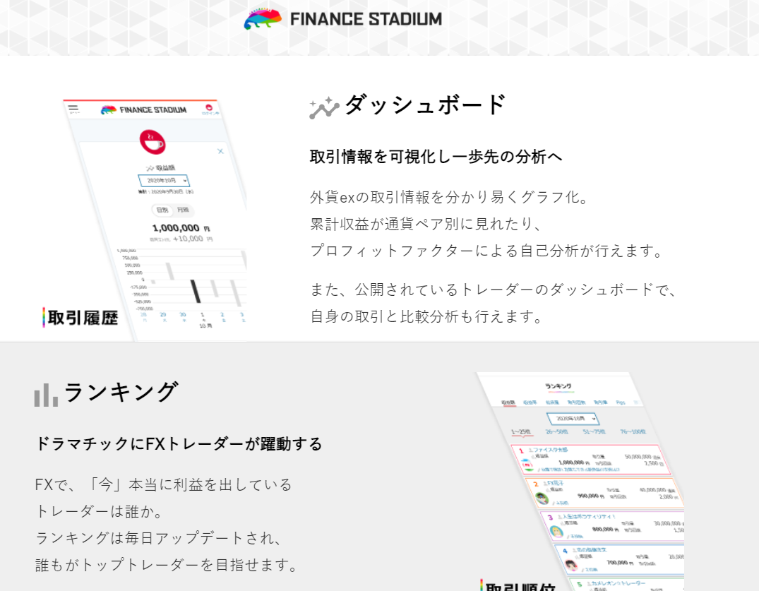今回復活した、新生ファイナンススタジアムでは「FXトレーダーランキング」や取引履歴を可視化した「ダッシュボード」、FX業界の著名人による「限定コラム」等、マーケット情報に加え従来のFX情報サイトのイメージを刷新する個性的なキュレーションサイトとなっている。さらに同社によると、今後ランキングによるイベント開催やさまざまなコンテンツの拡張を予定しているという。