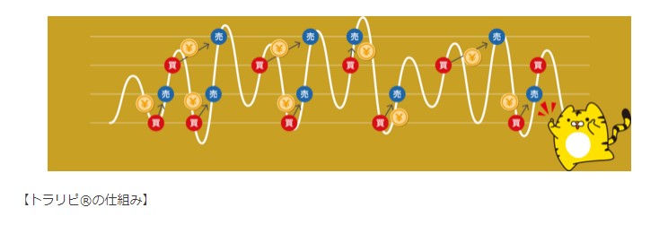 トラリピ®は、「トラップリピートイフダン®」という注文方法の略称。マネースクエアHDが特許を取得している。ユーザーが決めた価格で、自動的に売買をくり返す。ユーザーに代わって24時間、システムが利益を狙うことで、普段の暮らしを邪魔することなくFXが実行できる点が最大の強み。参考:MONEY SQUARE