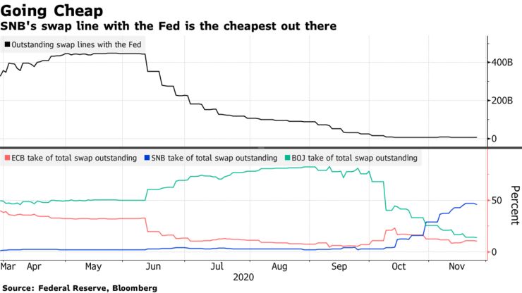 スワップラインは、スイス国立銀行(中央銀行)を通じた利用が特に多く、過去8営業日に3カ月物で57億ドル(約5940億円)の借り入れがあった。スイス中銀はスワップの担保となる証券の多くでヘアカット(担保価値の削減)をしないため、利用が多い傾向にある。日本銀行の場合、10年物国債の担保掛目は98.6%、欧州中央銀行(ECB)はドイツ国債に対し96%という数字である。