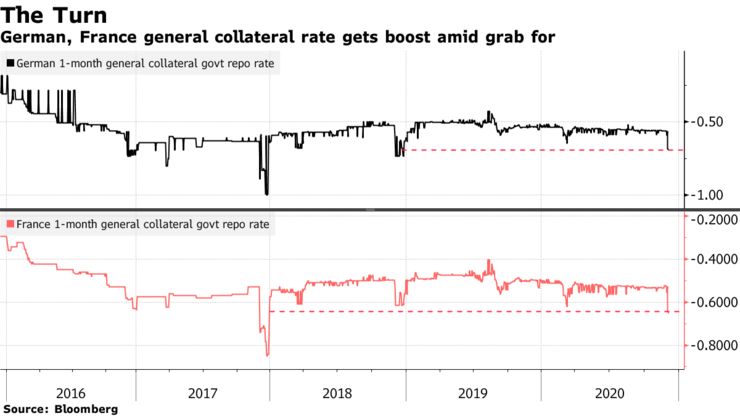 ドルを借りる担保として差し入れる債券を持っていない投資家は、債券を借りる必要がある。その影響がレポ市場に顕著に表れている。ドイツとフランスの国債を1カ月間借りるコストは急上昇。したがって、GCレートはそれぞれ2年と3年で最も大きなマイナスになった。マイナスのレートは証券を担保に現金を貸す投資家が利息を支払うことを意味している。