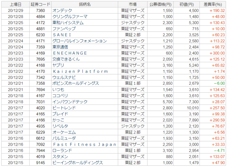 以下に実績として、2020年12月のIPO株の公募価格と初値をまとめてみたので、参考にしてみてください。