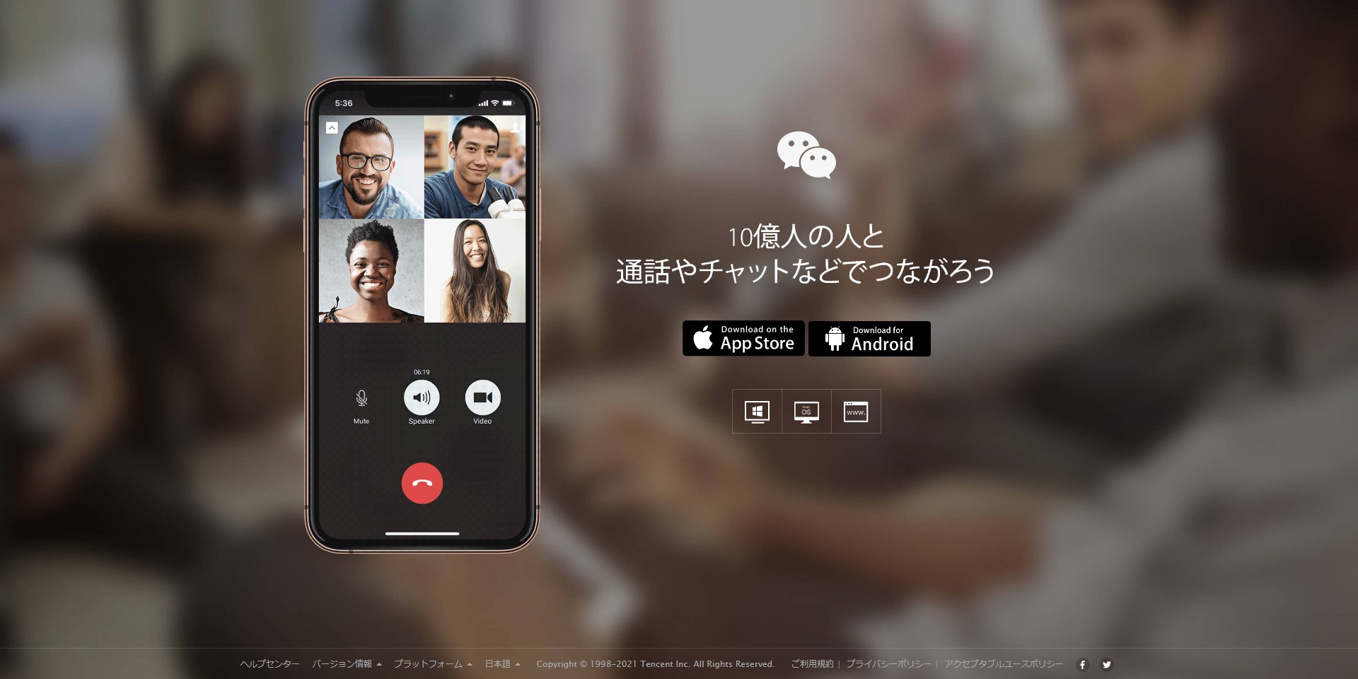 WeChat(微信:読み方weixin、ウィーチャット)は、Tencent(騰訊)が2011年にリリースした、文字や音声、写真や動画、グループチャットなどでコミュニケーション通知など基本機能が出来る無料メッセージアプリ。ユーザー数は中国国内約7億人、世界で12億人以上、月間アクティブユーザーは8.89億人以上と、世界でも最大規模を誇る。中国人の日常メッセージはほとんどWeChatで行われており、スマートフォン・PCともに利用可能。登録ユーザーは男女比が1.8:1、年齢層は18~25歳が約45%、26~35歳が約40%と2つの層で8割以上を占めている。