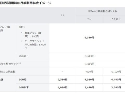 残りの2プランは、音声通信の基本プラン(980円)とデータ通信プラン(5,600円)のセット。テザリングでのデータ使用には月間30GBの上限を設け、利便性を向上させる。使用したデータ量が3GBを切る場合は自動的に料金を1,500円割り引く。「おうち割 光セット」「新みんな家族割」などの割引を適用した場合の月額料金は2,980円からとなる見込みだ。